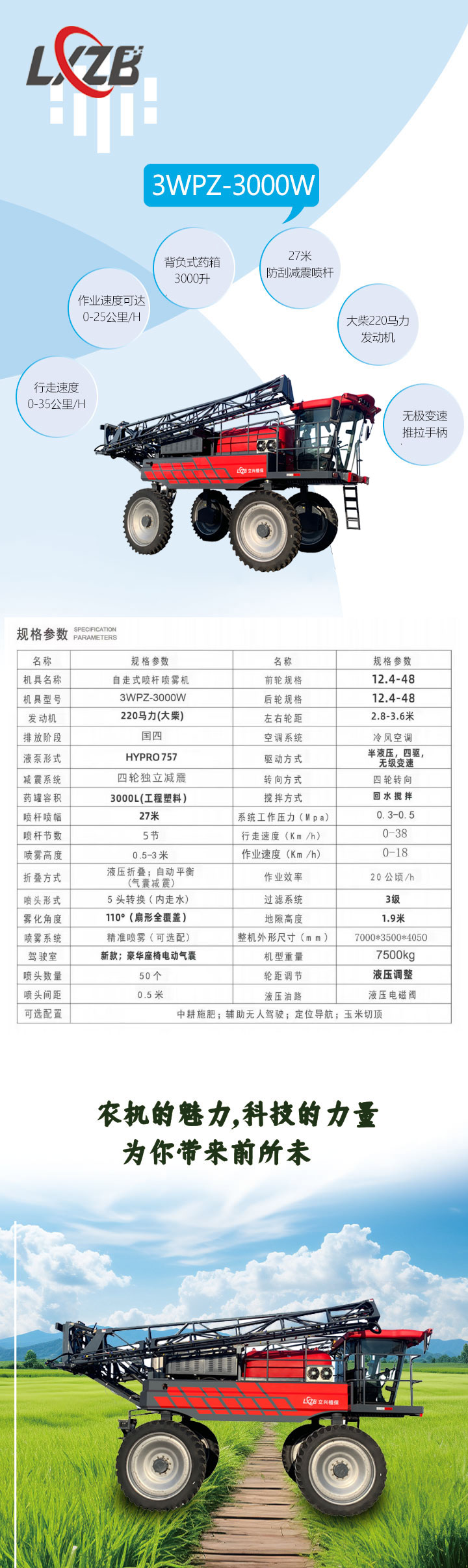3WPZ-3000W噴藥切頂及一體的噴桿噴霧機行走速度可以達到0-35公里/H。作業(yè)速度根據(jù)作業(yè)條件可達0-25公里/H3WPZ-3000W搭配3000升的背負式藥箱;27米防刮減震噴桿,配備自動平衡功能。五頭轉(zhuǎn)換美國噴頭。此機型采用錫柴國四排放標準220馬力發(fā)動機。噴藥水泵采用美國HYPRO品牌大流量離心泵(757L/MIN)。機械液壓相結(jié)合的傳動方式是立興打藥機的獨有技術(shù),已經(jīng)在10余種機型,2000多臺機器上配套使用,技術(shù)成熟可靠。原理(伊頓液壓大崩傳動液壓馬達,液壓馬達傳動變速箱;利用變速箱換檔提升扭矩。這套驅(qū)動技術(shù)大幅度提升了該車型的防陷能力搭配四輪獨立懸掛,減震效果優(yōu) 秀,在坑洼地塊駕駛感舒適。經(jīng)過長時間高負荷泥濘地面測試。整體通過性及強。無極變速推拉手柄操作行走非常簡單,整車全部功能都可以在扶手箱電控按鍵上進行操作。新款豪華駕駛室,氣動懸浮座椅。進口智能噴霧系統(tǒng)、噴霧系統(tǒng)外走水單體110°全覆蓋噴灑,回水攪拌,三級過濾,液壓操作,可加裝精準噴霧,實現(xiàn)精準噴灑不浪費藥液,達到高 效使用效果,提高了該機型操作 安 全 性,使用可靠性,維護便捷性及舒適性。