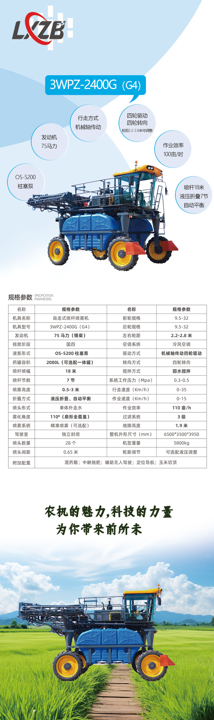 3WPZ-2400G(G4)自走式噴桿噴霧機是一種集噴藥,切頂,施肥等功能于一體的噴藥設(shè)備此機型采用錫柴國四排放標準75馬力發(fā)動機,0S-5200柱塞泵,配備全封閉獨立駕駛室。該機型行走方式采用機械軸傳動,在泥濘道路中驅(qū)動力強,脫困能力強,適合多地形作業(yè);四輪驅(qū)動四輪轉(zhuǎn)向,輪距2.2米-2.8米可調(diào)整(可選配液壓調(diào)節(jié)輪距》,設(shè)計結(jié)構(gòu)合理,維修便捷,作業(yè)質(zhì)量好,作業(yè)效率可達每小時100畝。
