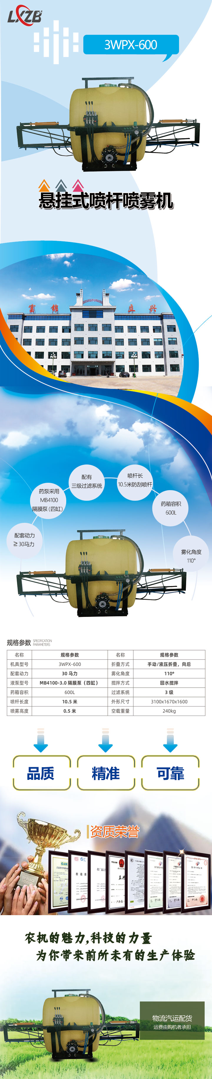 3WPX-600懸掛式噴桿噴霧機(jī)配套動力230馬力,藥泵采用MB4100隔膜泵(四缸),配有三級過濾,回水?dāng)嚢韫δ芩幭淙莘e600L,噴桿長10.5米防刮噴桿,噴霧高度0.5米,霧化角度110°,手動/液壓折疊,向后,小容積懸掛噴桿噴霧機(jī)更適合小地塊矮作物的作業(yè)。