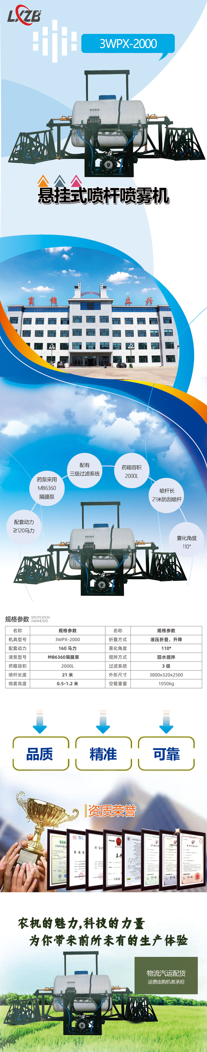 3WPX-2000懸掛式噴桿噴霧機(jī)配套動(dòng)力2120馬力,藥泵采用MB6360隔膜泵,配有三級過濾,回水?dāng)嚢韫δ?,藥箱容積2000L,噴桿長21米防刮噴桿含有自動(dòng)平衡,噴霧高度0.5米-1.2米,霧化角度110°,噴桿液壓折疊、升降,跟適合大型農(nóng)場大型機(jī)械話噴霧作業(yè)。